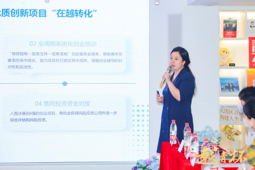 在创业培训会现场,广东文投创工场副总经理、运营事业部总裁陈姗姗女士代表大赛承办方作分享致辞,介绍了“越青杯”大赛开展进展情况和下一步赛事安排,表示将通过优化专家导师智库,丰富现场路演、实地考察、创业技能培训班等赛制环节,形成“导师指导—政策支持—成果落地”创业服务全链条,帮助青年在赛事历练中成长,助力项目在打磨培育中成熟,增强创业辅导的针对性和实效性,让创业青年在大赛中感受“越秀温度”,吸引更多优质项目、优秀人才落户越秀。