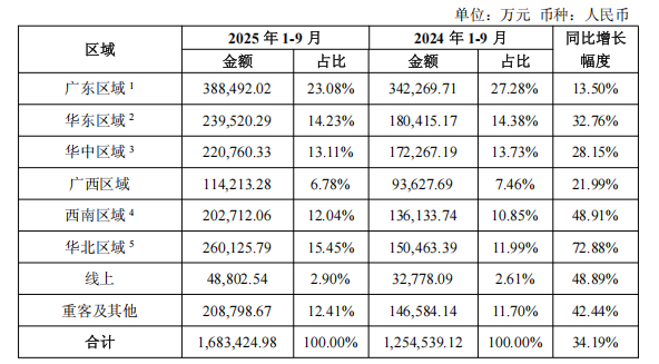2025年前三季度,东鹏饮料通过广东区域持续全渠道精耕,同时积极开拓全国销售渠道,成功实现增长动力多点扩散,区域结构持续优化。数据显示,广东区域(含海南)仍保持稳健,前三季度收入38.85亿元(同比+13.50%),占比23.08%,持续作为基本盘为全国扩张提供支撑;而全国其他区域增长显著,华北区域(含15省市)收入26.01亿元(同比+72.88%),占比从11.99%升至15.45%,西南区域收入20.27亿元(同比+48.91%),占比从10.85%升至12.04%。