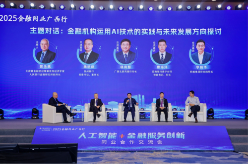 在主题对话环节,贵州银行党委书记、董事长杨明尚,广西北部湾银行行长杨育智,招商银行南宁分行党委书记、行长曹海洋,蚂蚁集团研究院院长李振华等嘉宾围绕 “金融机构运用AI技术的实践与未来发展方向探讨”展开深入对话、交流,为金融赋能广西打造面向东盟的金融开放门户、服务地方经济高质量发展提供创新思路。