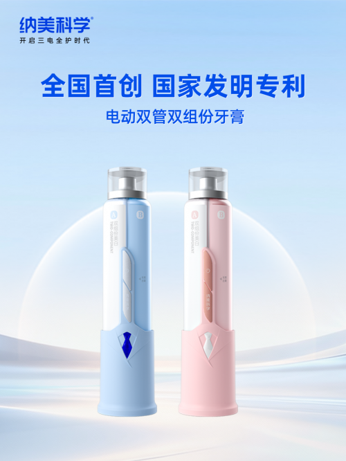一是电动双管双组份牙膏,实现活性成分与功效的突破。 针对传统单管牙膏中某些有效成分可能相互影响、稳定性与活性随储存时间下降的行业共性难题,纳美科学开创性地研发了电动双管分仓储存技术。该技术将不同功效核心成分(如美白成分与修护成分)物理隔离、分仓保存,确保其活性和稳定性。使用时通过电动按压实现1:1精准混合,瞬时激活高效美白护齿作用。经第三方权威机构检测验证,该产品在美白效率和提升牙齿硬度方面表现突出,经权威机构验证,其美白效率提升高达823.75%,实现美白与护龈兼得。目前已获得多项国家发明专利。
