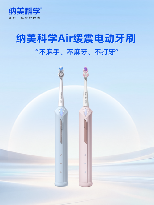 三是电动Air缓震牙刷,提升洁齿体验与舒适度。 在电动牙刷领域,纳美科学聚焦于改善用户使用体验,特别是针对敏感人群和正畸人群的特殊需求。其自主研发的Air缓震专利技术,通过特殊的结构设计使刷头能够缓冲并自适应牙齿表面起伏,有效减轻了常见电动牙刷可能带来的”打牙、麻牙“不适感。结合多重清洁模式和优质刷丝材料,在保证清洁效果的同时,显著提升了使用的舒适性和安全性。