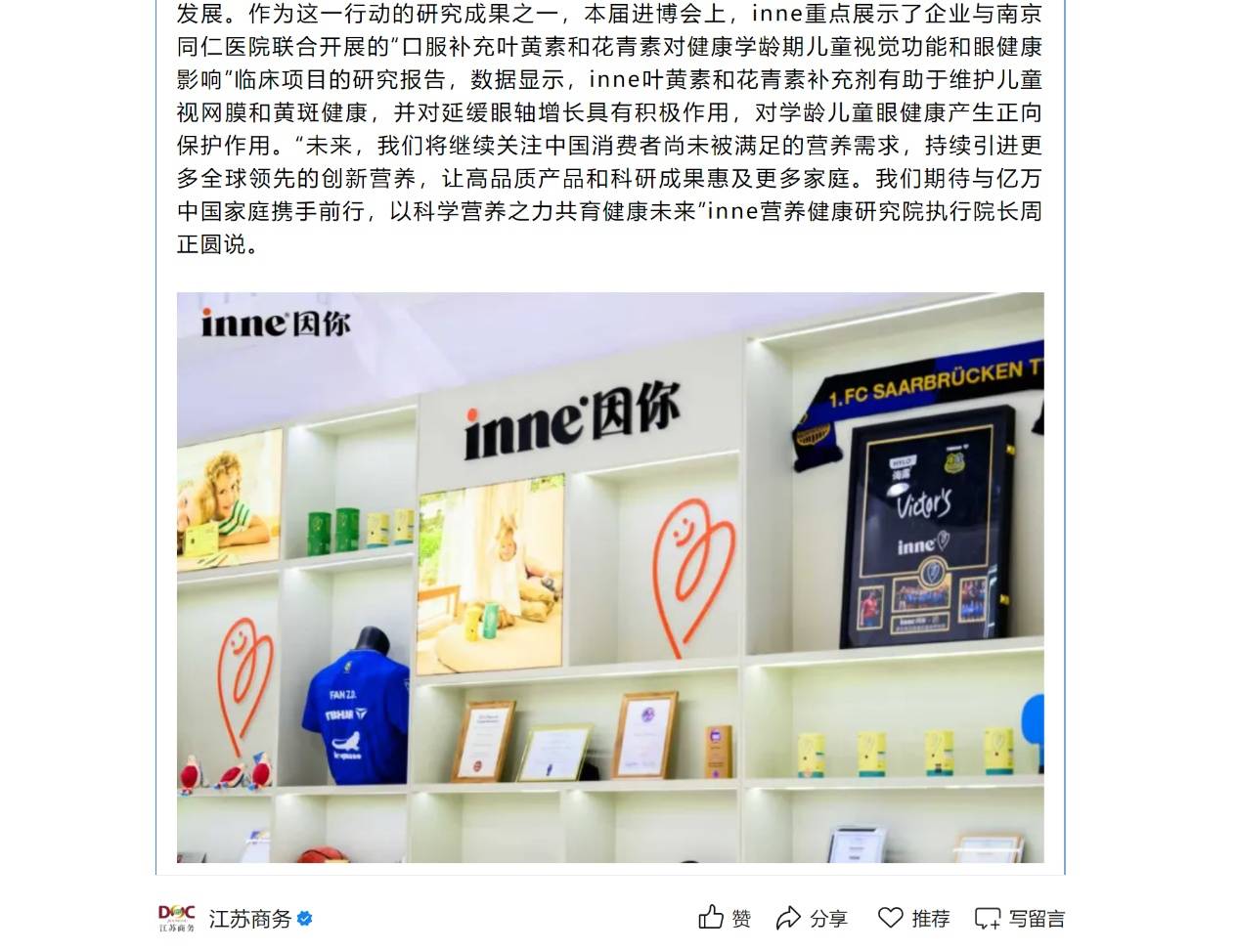 江苏省商务厅在进博报道中指出,本届健康营养专区首次提出“主动健康”理念,并将 inne 因你作为实践案例之一。报道提到,品牌与多家三甲医院推进儿童营养临床研究,其中与南京同仁医院的临床合作显示:inne 叶黄素与花青素补剂有助于维护儿童视网膜和黄斑健康、延缓眼轴增长,对儿童眼健康防护具有积极意义。