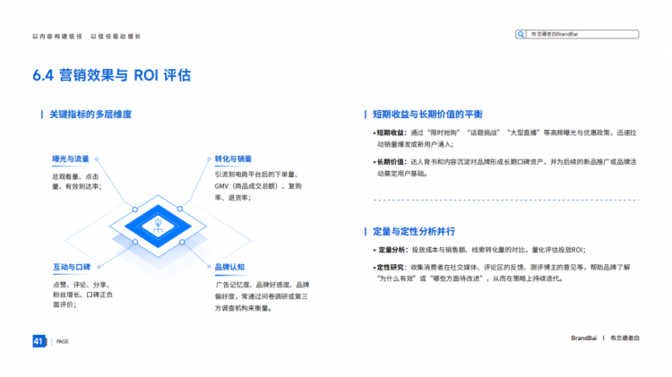 布兰德老白: 短期效果是生存基础,长期价值是发展空间。两者不矛盾,甚至可以相互促进。优质的品牌内容能提升用户信任,从而提高短期转化效率;而有效的短期转化能带来现金流,支撑长期的品牌内容投入。策略上要有组合拳。衡量ROI时,除了GMV,建议关注: