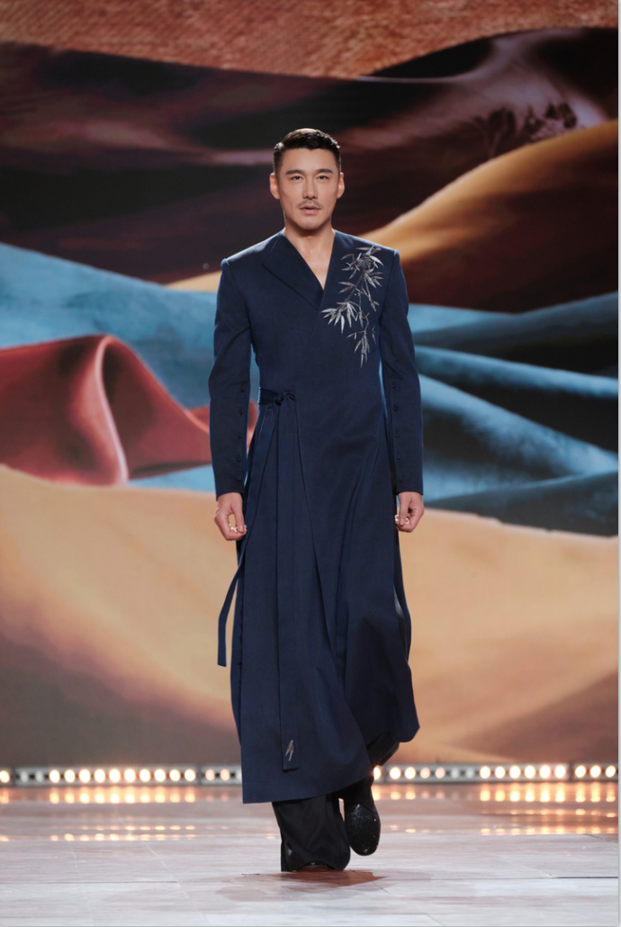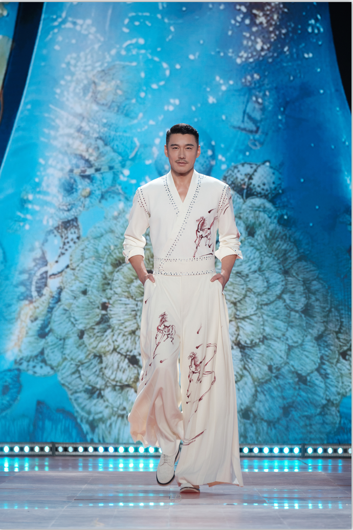 2月20日的非遗晚会中,胡兵参与《非遗里的中国》相关表演,先后身着汉绣、香云纱与苗绣三套非遗服饰亮相舞台。其中香云纱作为中国传统植物染面料,以日晒与河涂工艺形成独特光泽与肌理,被誉为“会呼吸的丝绸”,在节目中以更当代的方式被重新呈现。通过将非遗穿在身上,舞台不再只是展示工艺本身,而是让传统技艺在行走与表演中进入当代语境。