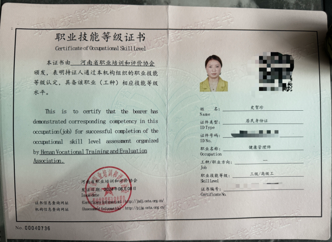 专业是服务的根基,史贺珍拥有多重权威资质认证,持有美容师四级、高级健康管理师三级、化妆品配方师高级证书,为其护肤服务提供了坚实的专业支撑。作为医学护理专业毕业生,她始终深耕皮肤护理领域,将医学护理理念与护肤专业深度融合,潜心钻研各类肌肤问题,秉持严谨务实的态度对待每一位寻求帮助的姐妹。