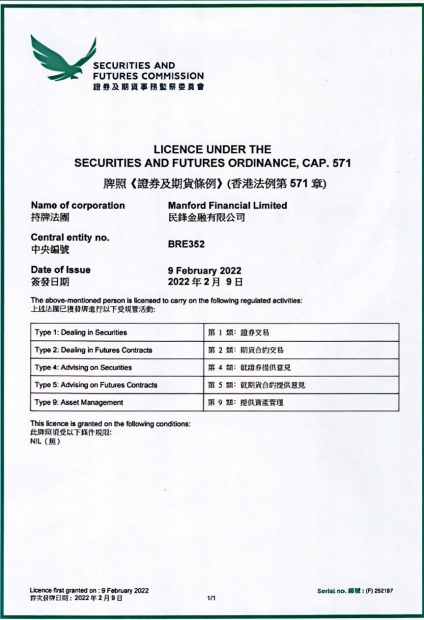 相关牌照主体包括 民锋金融有限公司(Manford Financial Limited,中央编号 BRE352) 以及 美源金融服务有限公司(MC Financial Services Limited,中央编号 BLC140),用户可以通过香港证监会官方网站查询相关牌照信息进行官方核验。