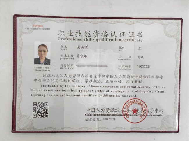 专业是立身之本,更是黄美蓉服务VIP的底气。不同于行业内的浮华宣传,她始终脚踏实地深耕专业,手握高级美容师(三级)、中级美容师(四级)、高级健康管理师(三级)、高级化妆品配方师、高级公共营养师等多项国家级权威认证,构建起多维度的专业知识体系。十余年一线实战经验,让她不仅熟练掌握表层皮肤护理技巧,更能深入解读肌肤底层机理,结合化妆品配方知识与营养内调理念,精准定位肌肤问题根源,为VIP提供长效、科学的改善方向,打破单一护肤的局限。