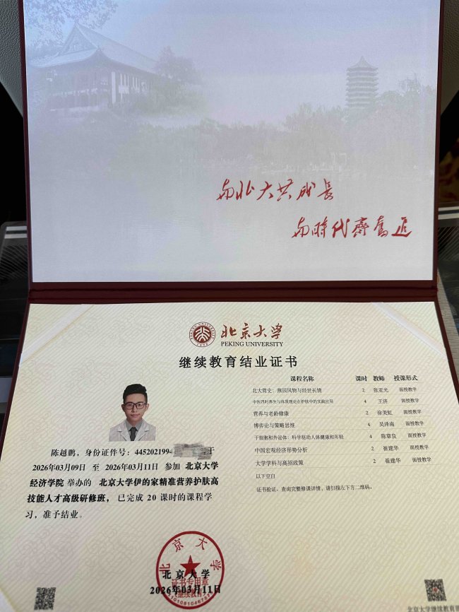 陈越鹏的学习之路从未停歇。他持有健康管理师、公共营养师、美容师、中医药膳师、化妆品配方师等多项权威资质,每一张证书的背后都凝聚着大量的时间投入和刻苦钻研。这些专业证书不仅是能力的证明,更是他对专业精益求精态度的最佳诠释。