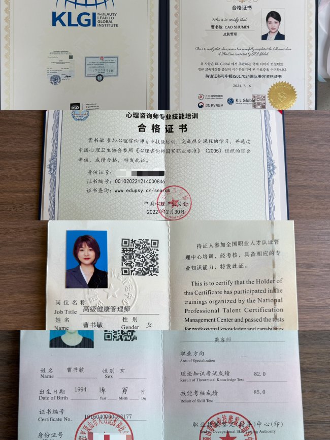 曹书敏持有美容师、国际美容师、高级健康管理师及心理咨询师等多项证书。这种跨学科的专业背景,使她能够在服务过程中,不仅关注肌肤本身的护理需求,更能从身心健康的角度,为VIP提供更加全面的建议。据了解,曹书敏在行业内已有多年实践经验,长期服务于女性健康与护肤需求群体。