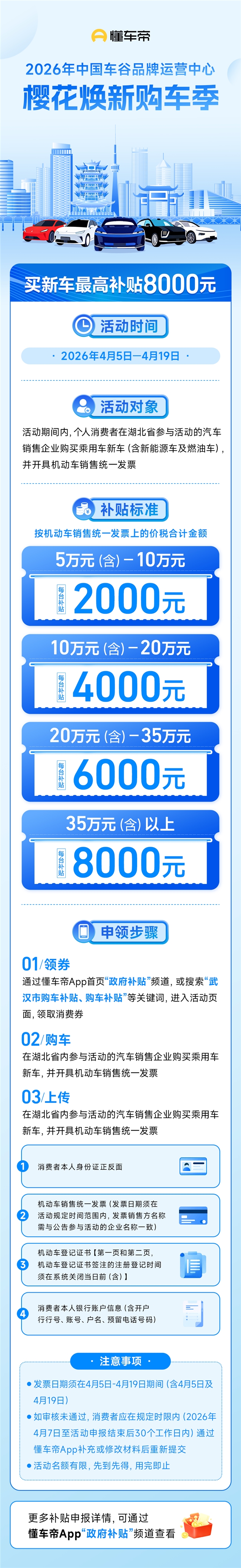 本次活动面向个人消费者。2026年4月5日至4月19日期间,消费者通过湖北省参与活动的汽车销售企业选购指定车型;按实际成交价支付车款,并取得机动车销售统一发票(发票开具时间应在2026年4月5日至4月19日之间,含4月5日及4月19日),即可申领优惠。